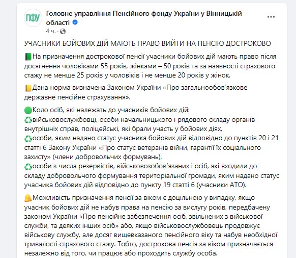 Так, згідно із законодавством, на дострокову пенсію можуть вийти чоловіки та жінки з числа бойових дій. Вік виходу чоловікам 55 років за стажу щонайменше 25 років, а жінок – 50 років за стажу щонайменше 20 років.