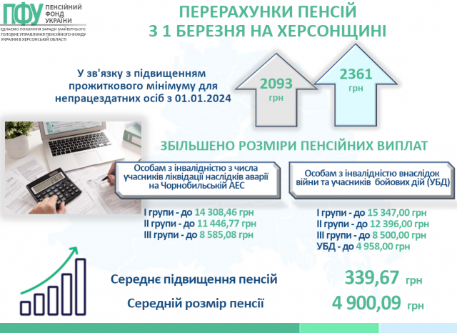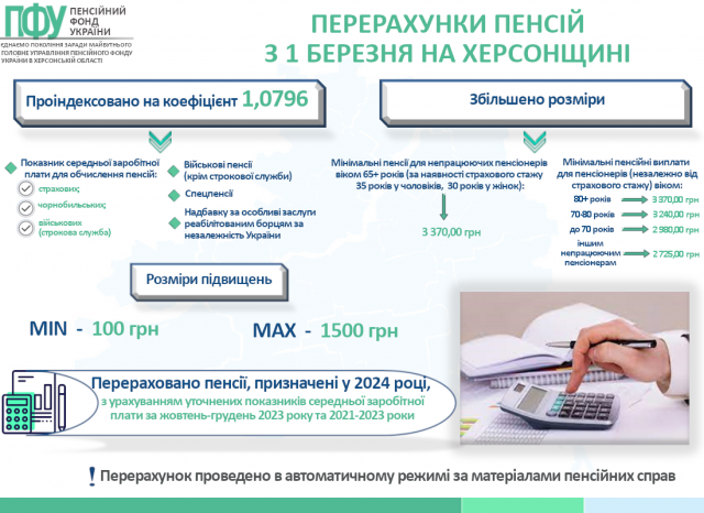 З 1 березня 2024 року на виконання постанови Кабінету Міністрів України від 23 лютого 2024 року № 185 “Про індексацію пенсійних і страхових виплат та додаткових заходів щодо підвищення рівня соціального захисту найбільш вразливих верств населення у 2024 році” Головним управління Пенсійного фонду України в Херсонській області проведено індексацію пенсій, підвищено розміри мінімальних пенсій по інвалідності колишнім військовослужбовцям та постраждалим внаслідок Чорнобильської катастрофи, збільшено рівень мінімальних пенсійних виплат окремим віковим категоріям пенсіонерів.Відповідно до вищевказаної постанови Уряду перерахунку підлягають пенсії, призначені за Законами України “Про загальнообов’язкове державне пенсійне страхування“, “Про статус і соціальний захист громадян, які постраждали внаслідок Чорнобильської катастрофи“ та “Про пенсійне забезпечення осіб, звільнених з військової служби, та деяких інших осіб“ (особам з числа військовослужбовців строкової служби) із застосуванням коефіцієнта підвищення у розмірі 1,0796.