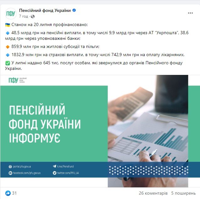 ПФУ розкрив важливі дані щодо виплати пенсій, субсидій та лікарняних у липні