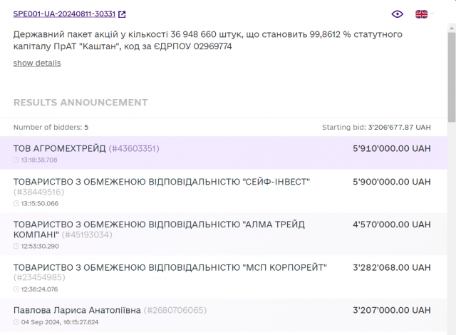Стартова ціна під час продажу підприємства становила 3,2 мільйона гривент. Переможець під час аукціону запропонував 5,9 мільйона, лише на 10 тисяч гривень випередивши свого найближчого суперника. ТОВ «Агромехтрейд», яке і перемогло, зареєстровано чотири роки тому на Рівненщині. Наразі чекають до публікації остаточний протокол аукціону, який відбувся 5 вересня.