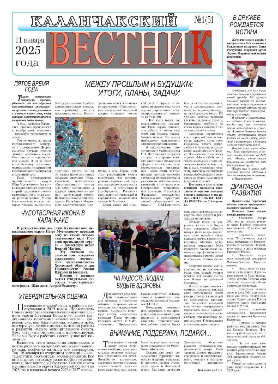 У першому у 2025 році номері традиційно знаходимо фото окупаційного голови Петра Мустіяновича, але чомусь немає… Путіна! Хоча окупаційний редактор Галина Єрмишко у тексті запевняє, що у її голові і головах інших зрадників нічого не змінилось: «На відміну від пісенних рядків «Мы с тобой, мы с тобой не собъёмся с пути, потому что дороги не знаем…», ми з вами, шановні читачі, жителі Каланчацького округу, обрали дорогу творення на благо нинішніх і майбутніх поколінь». Хоча, що саме було створено у минулому році, вирішила не уточнювати. Лише процитувала свого «шефа» Мустіяновича: «Хто очі має, той бачить зміни».