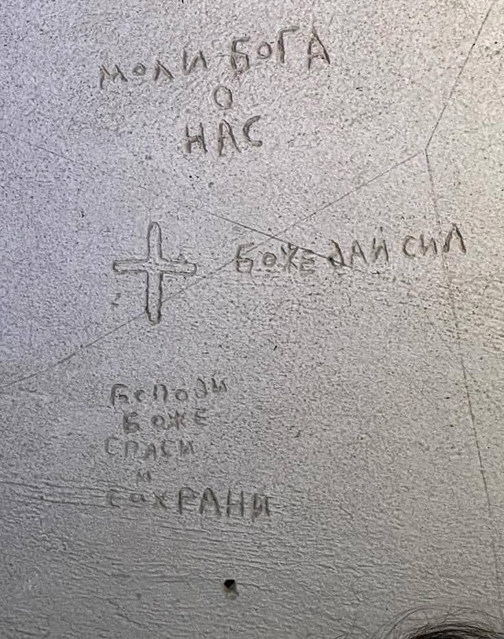Написи на стінах катівні, які залишали полонені в приміщенні “Украгропромпроєкту”. Фото: Данило