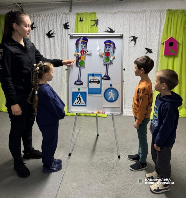 Найменшим – вихованців херсонського дитсадка – поліцейські у формі гри пояснили, як переходити дорогу, що означають кольори світлофора, чому важливо носити світловідбиваючі елементи на одязі. Дітки із захопленням вивчали дорожні знаки, розглядали макети перехресть та вчилися розрізняти безпечні та небезпечні ситуації.