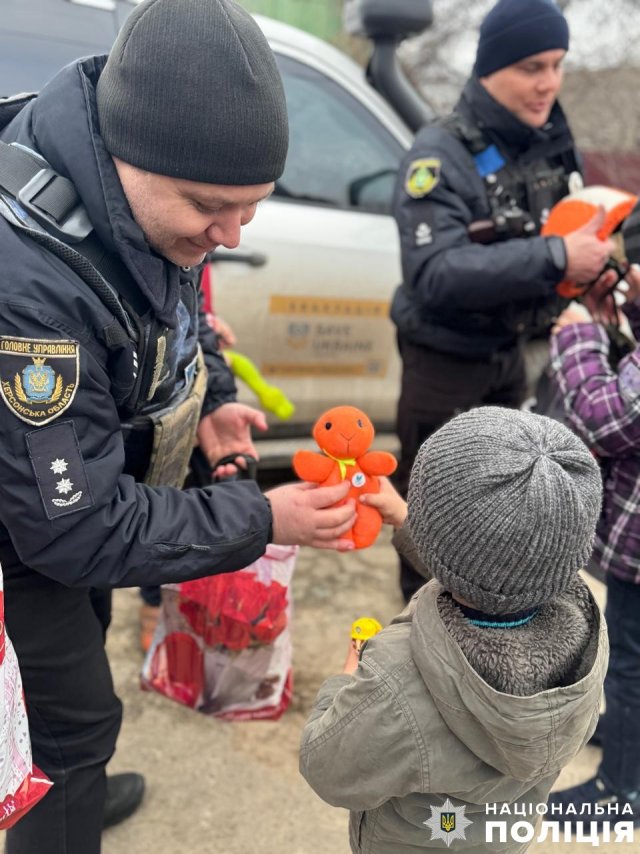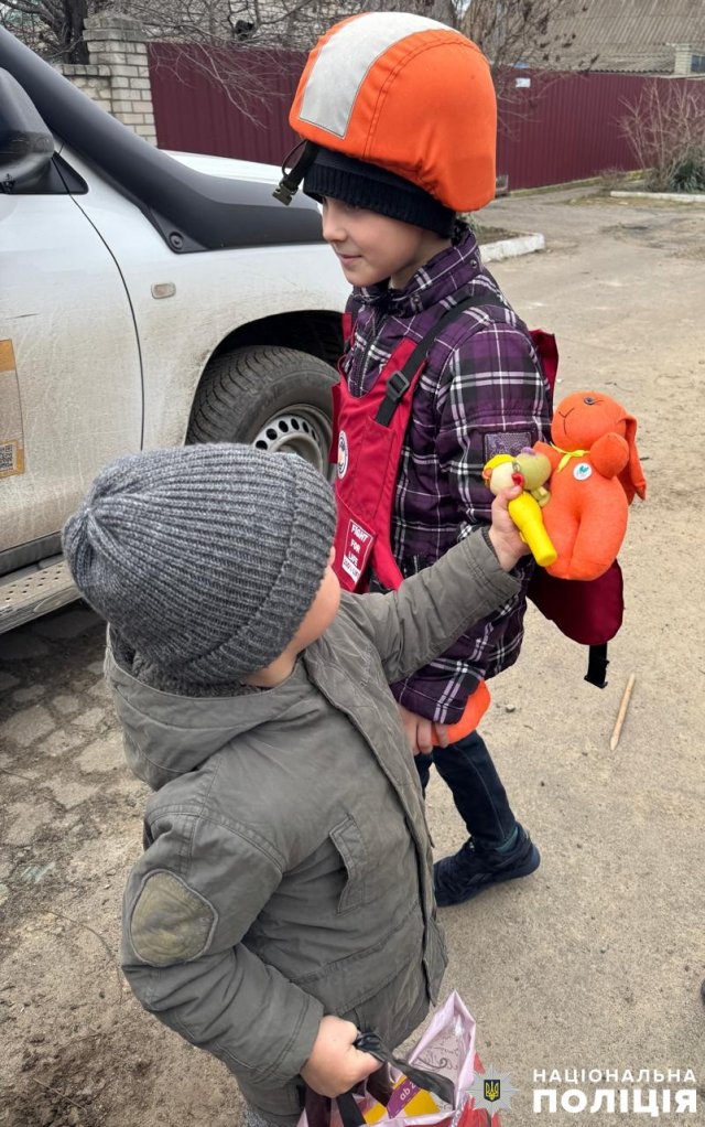 Також учора поліцейськими відділу поліції № 2 (Корабельний) спільно з колегами із відділення поліції № 2 (Олешківське) Херсонського районного управління вдалося безпечно евакуювати ще одну родину з постійно обстрілюваних прибережних Комишан. Наразі 39-річна матір з 8-річною донькою та майже 2-річним сином перебувають у безпеці й оговтуються після щоденних атак російської армії.А щоб всі діти могли у найкоротший термін адаптуватися на новому місці, не сумувати за своєю домівкою та хоч на деякий час забути жахи війни, поліцейські подарували їм іграшки – «зайчиків-охоронці» – та різні смаколики.