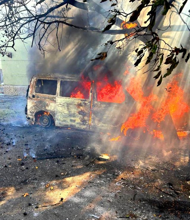 У Бериславі військові рф скинули боєприпаси з дрона поруч зі службовим автомобілем поліції. Внаслідок вибуху сталося загоряння автівки, працівники не постраждали. Також ворог здійснив артилерійський обстріл міста, поранено 70-річного місцевого жителя.