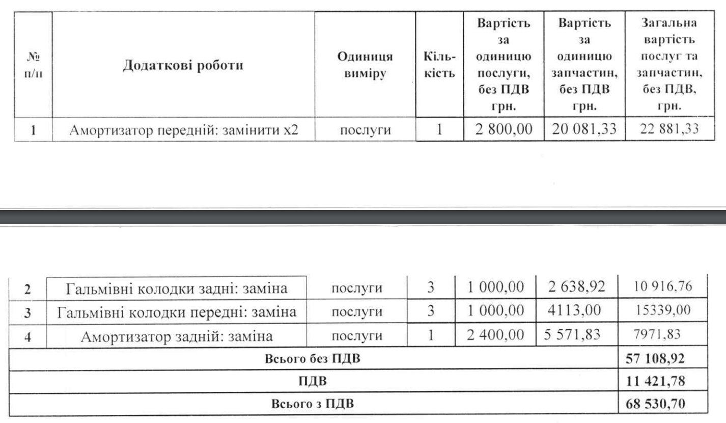 ГУ Нацполіції замовило послуги з технічного обслуговування та гарантійного ремонту автомобілів, при цьому, скільки саме авто хочуть ремонтувати та які саме послуги замовили, у договорі не вказано. Зазначена лише кількість послуг та їх вартість.