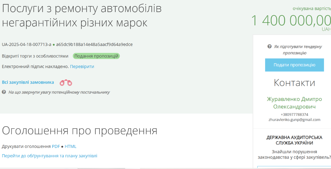 Закупівлю оголосили 18 квітня, тендерна пропозиція приймається до 26 квітня, а електронний аукціон запланували на 28 квітня.