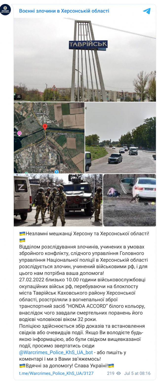 За даними слідства, 27 лютого .2022 близько 10.00 години військовослужбовці окупаційних військ РФ, перебуваючи на блокпосту міста Таврійськ Каховського району Херсонської області, розстріляли з вогнепальної зброї транспортний засіб HONDA ACCORD білого кольору, внаслідок чого завдали смертельних поранень його водієві чоловікові віком 32 роки.