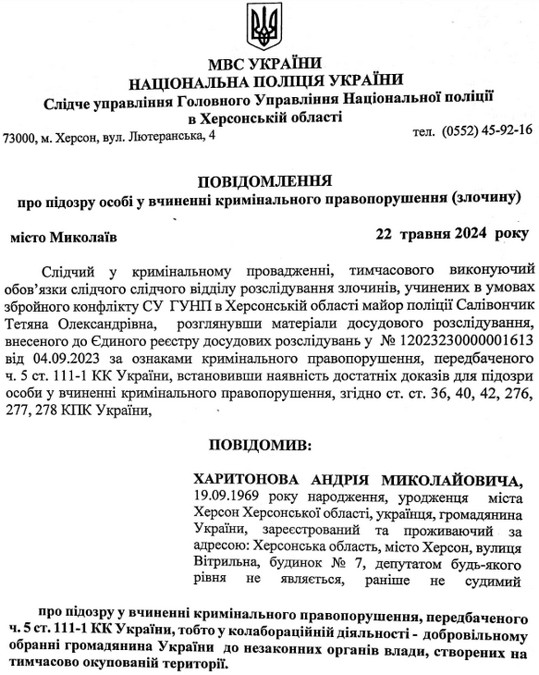 Підозрюваного звати Андрій Харитонов. Йому інкримінували колабораціонізм. За інформацією слідства, Харитонов запропонував свою кандидатуру на включення до списку партії “Єдина Росія” перед виборами незаконної Херсонської обласної думи.