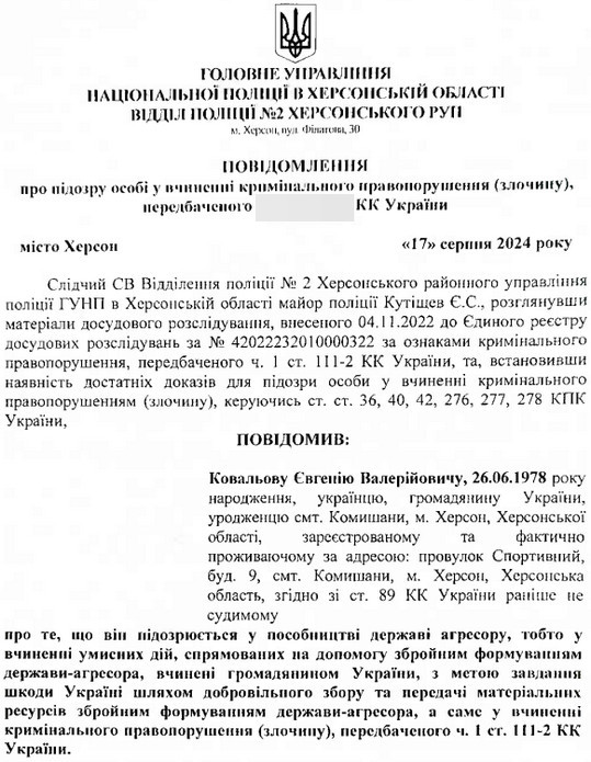 Ковальову інкримінували пособництво державі-агресору. За інформацією слідства, на посаді він у серпні – жовтні 2022 року передав збройним формуванням та окупаційній адміністрації 8 одиниць транспорту, які належать заводу.