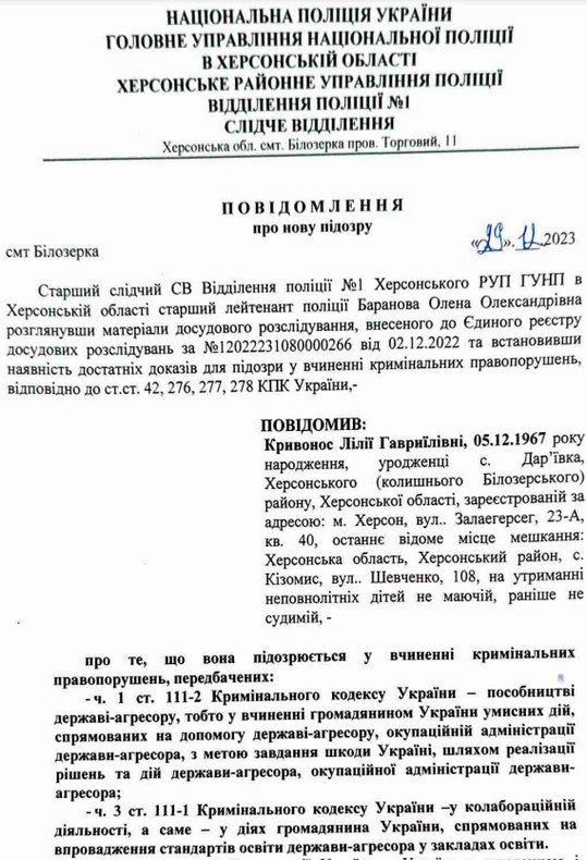 Якщо раніше Кривонос інкримінували колабораціонізм, то тепер їй додали пособництво-державі агресору.