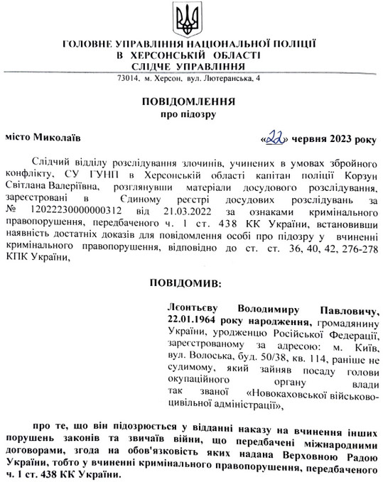 Поліція повідомила про підозру гауляйтеру Нової Каховки Володимиру Леонтьєву