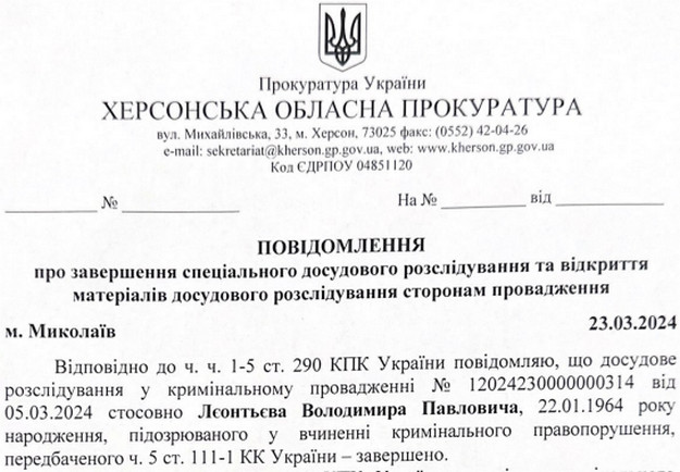 Підслідного звати Володимир Леонтьєв. В минулому він був головою окупаційної адміністрації Нової Каховки.