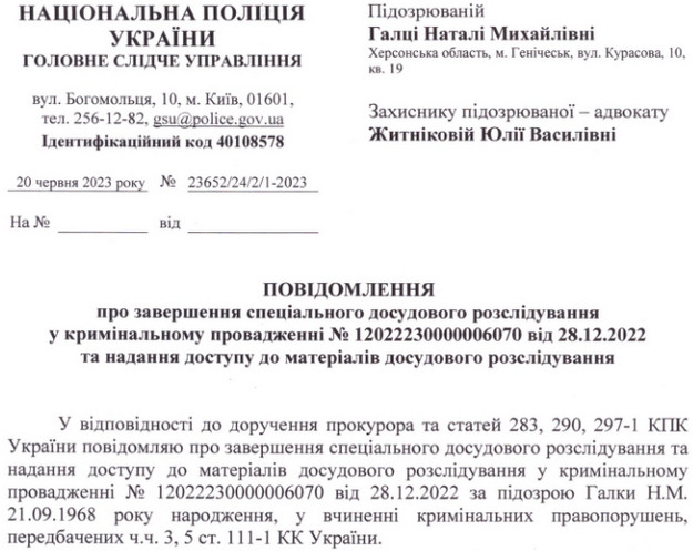 Додатково вона знімалась у сюжетах російських пропагандистів і приймала в стінах ліцею російського депутата Леоніда Слуцького. За це Галці загрожує кримінальна відповідальність.