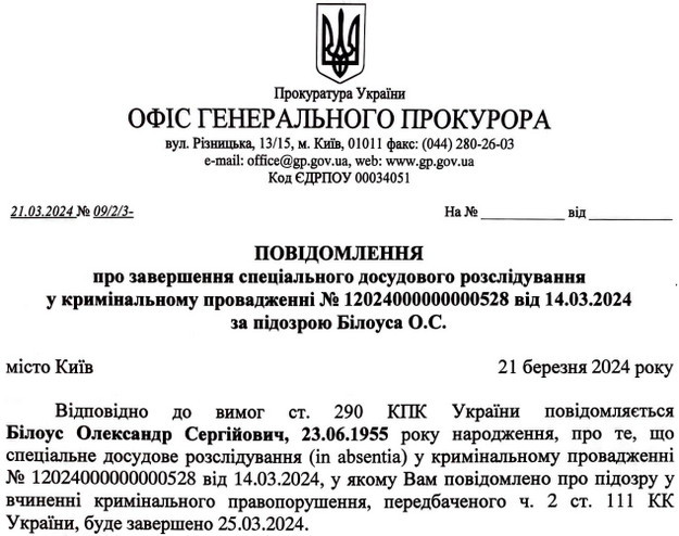 За це Олександру Білоусу заочно загрожує 15 років в’язниці або довічне ув’язнення (з конфіскацією майна).