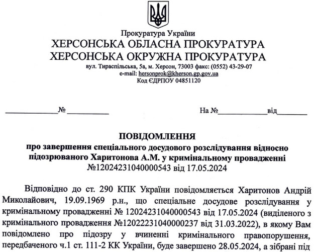 Харитонову інкримінували пособництво державі-агресору. За інформацією слідства, він пішов на співпрацю з росіянами влітку 2022 року. У жовтні того року голова окупаційної адміністраці Херсонської області Володимир Сальдо видав незаконне розпорядження про вивезення зернових з правобережжя.
