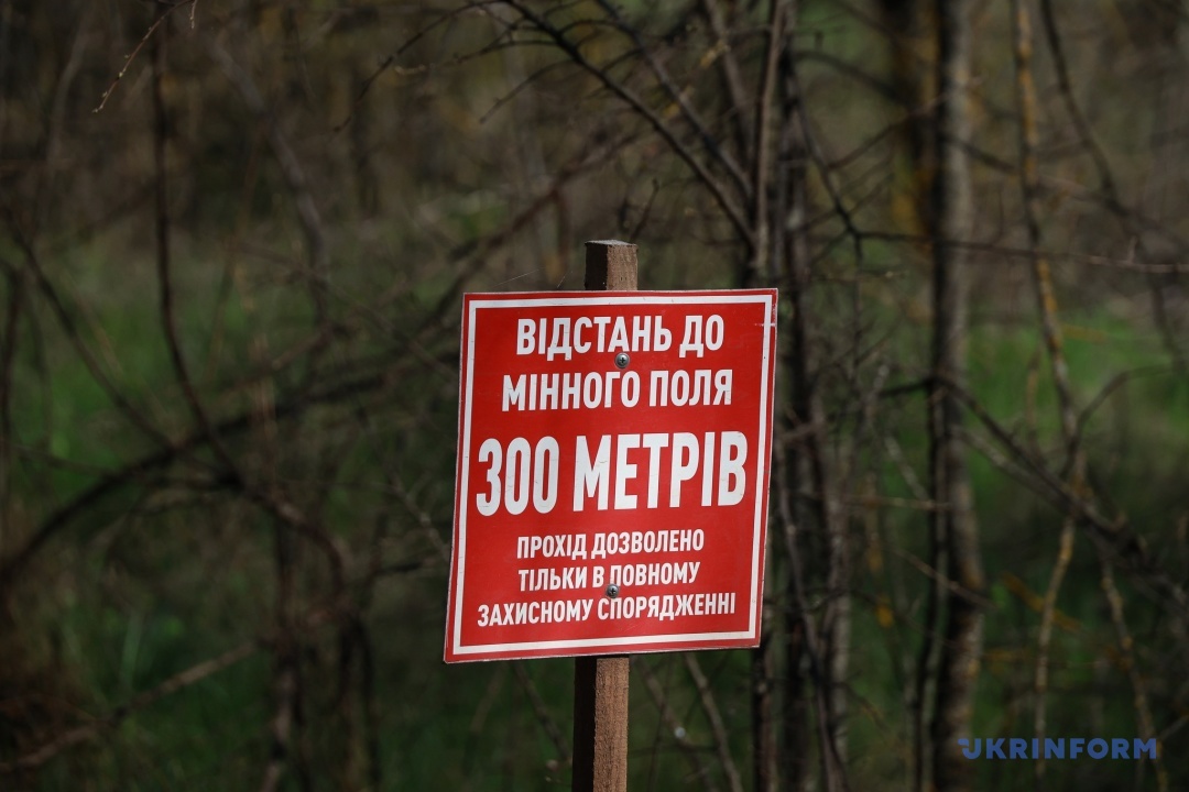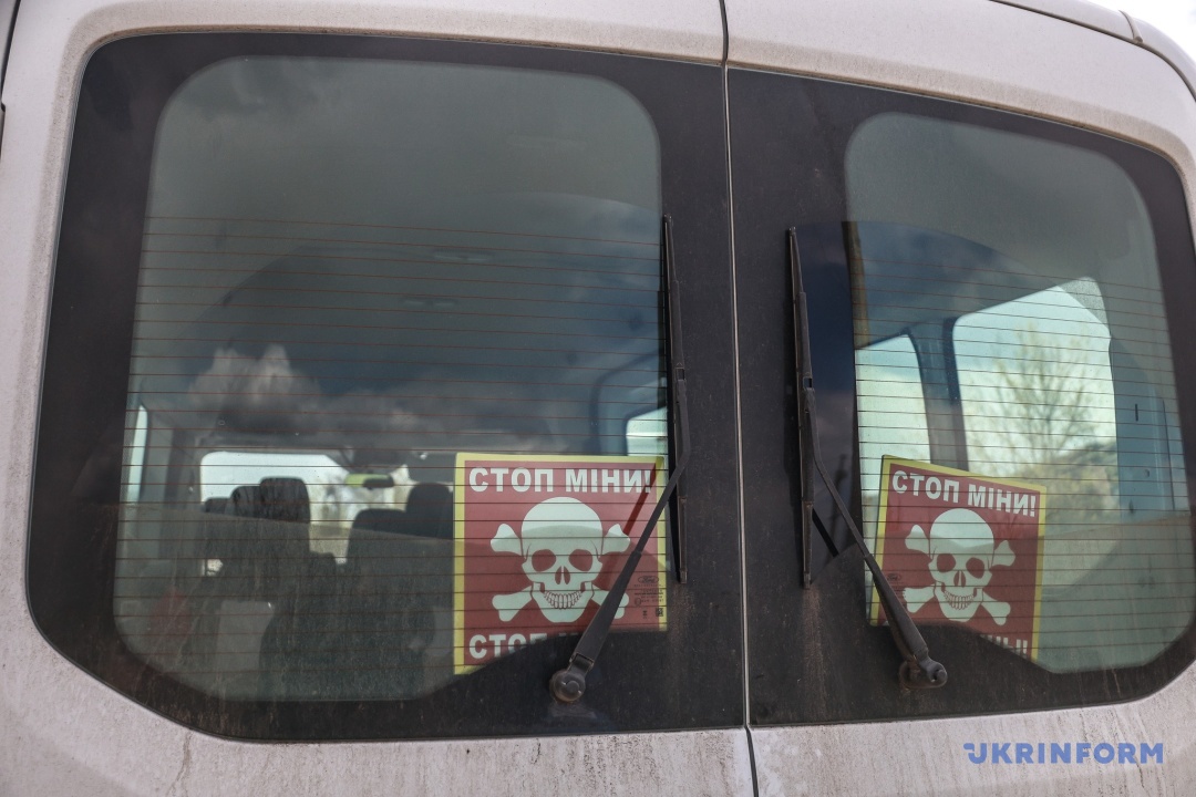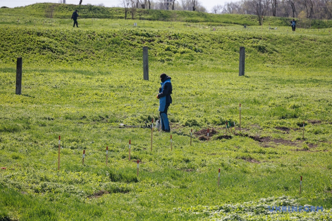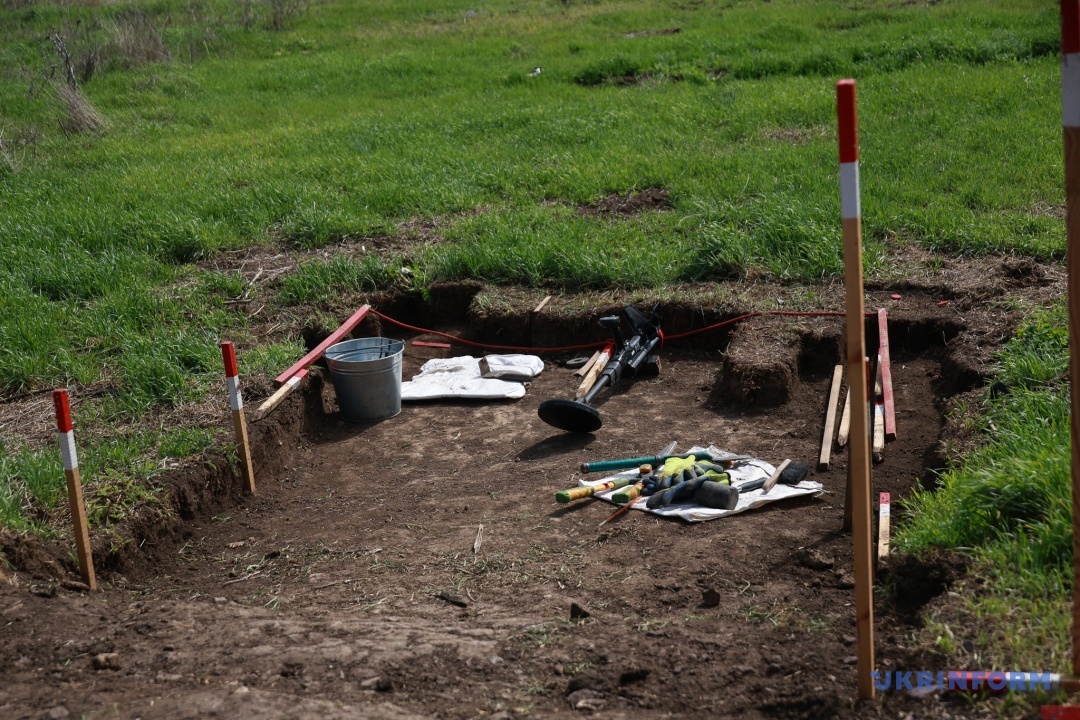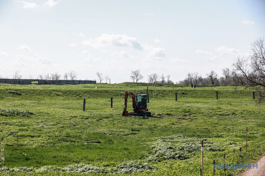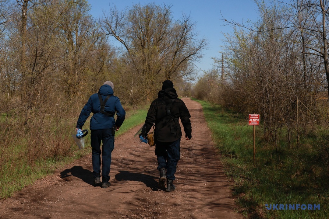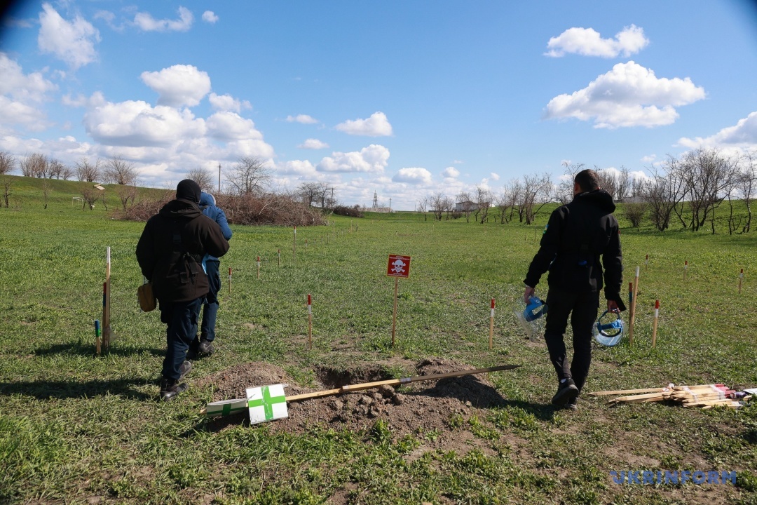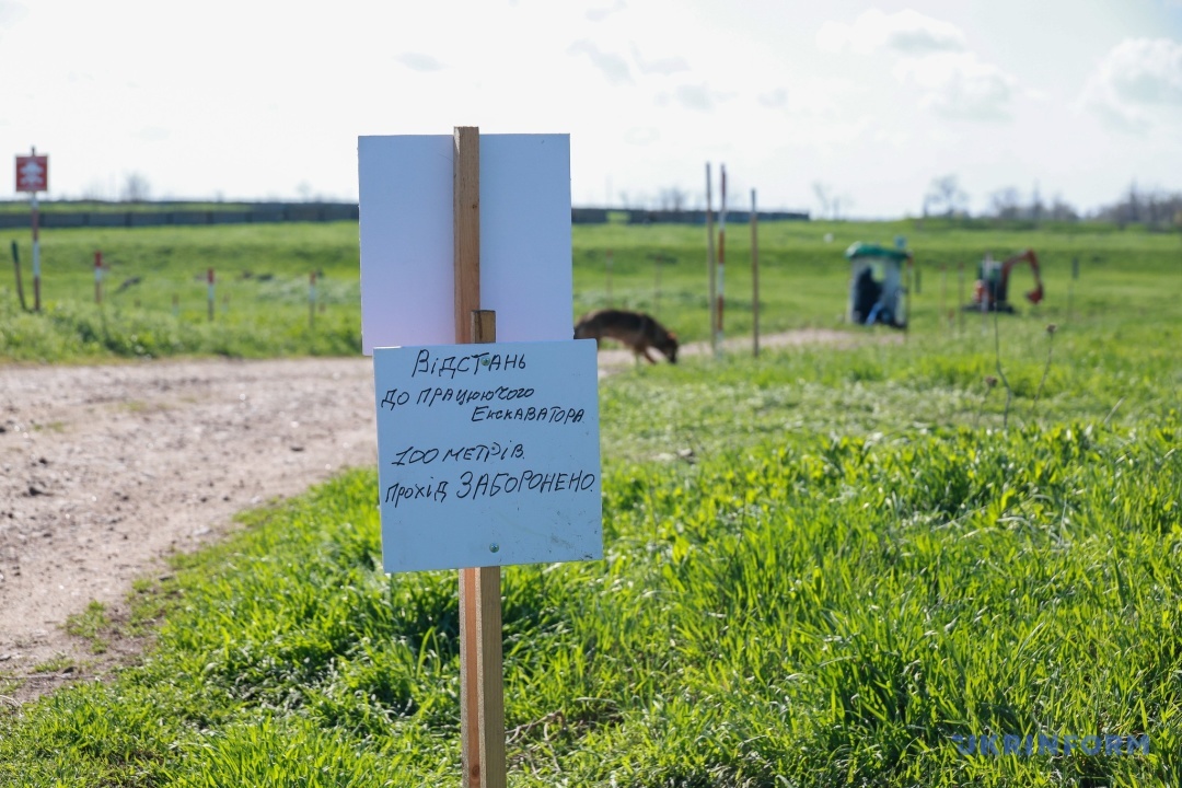 По обидва боки від дороги бачимо позначки: там – неперевірена земля, і ходити туди не слід. Серед весняної зелені стирчать високі червоні кілки, що сигналізують про ймовірну загрозу. Сильний крижаний вітер пробирає до кісток, проте демінери роблять свою справу. Групи ручного розмінування за допомогою металодетектора обстежують ґрунт на наявність сигналу та проводять екскавацію землі з вибухонебезпечним предметом. На ділянці працює механічна підтримка – міні-екскаватор.