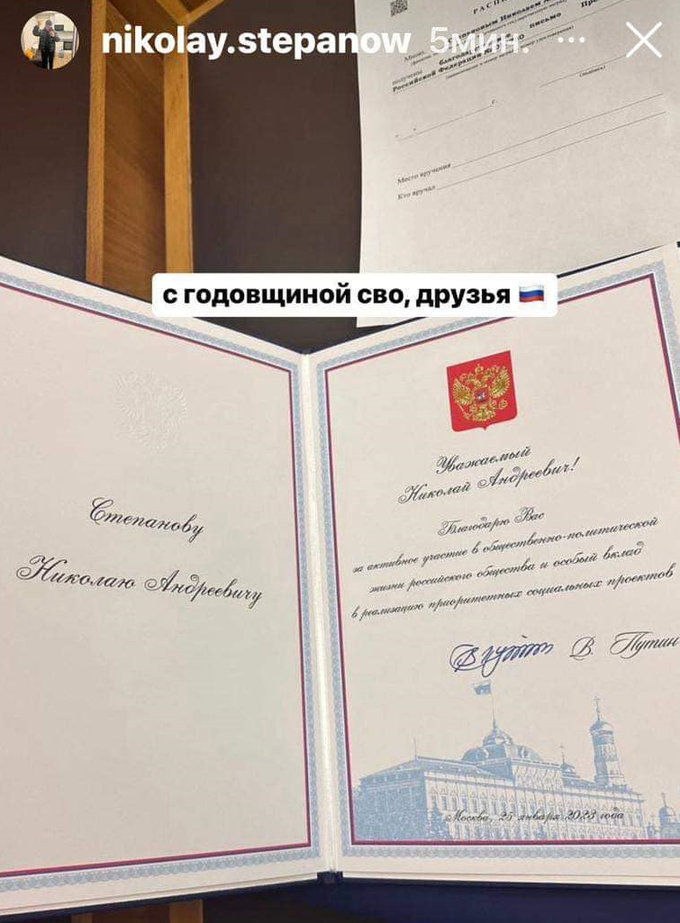 25 січня 2023 року Микола Степанов отримав подяку від президента РФ Владіміра Путіна «за активну участь у громадсько-політичному житті російського суспільства і особливий внесок у реалізацію пріоритетних соціальних проєктів».