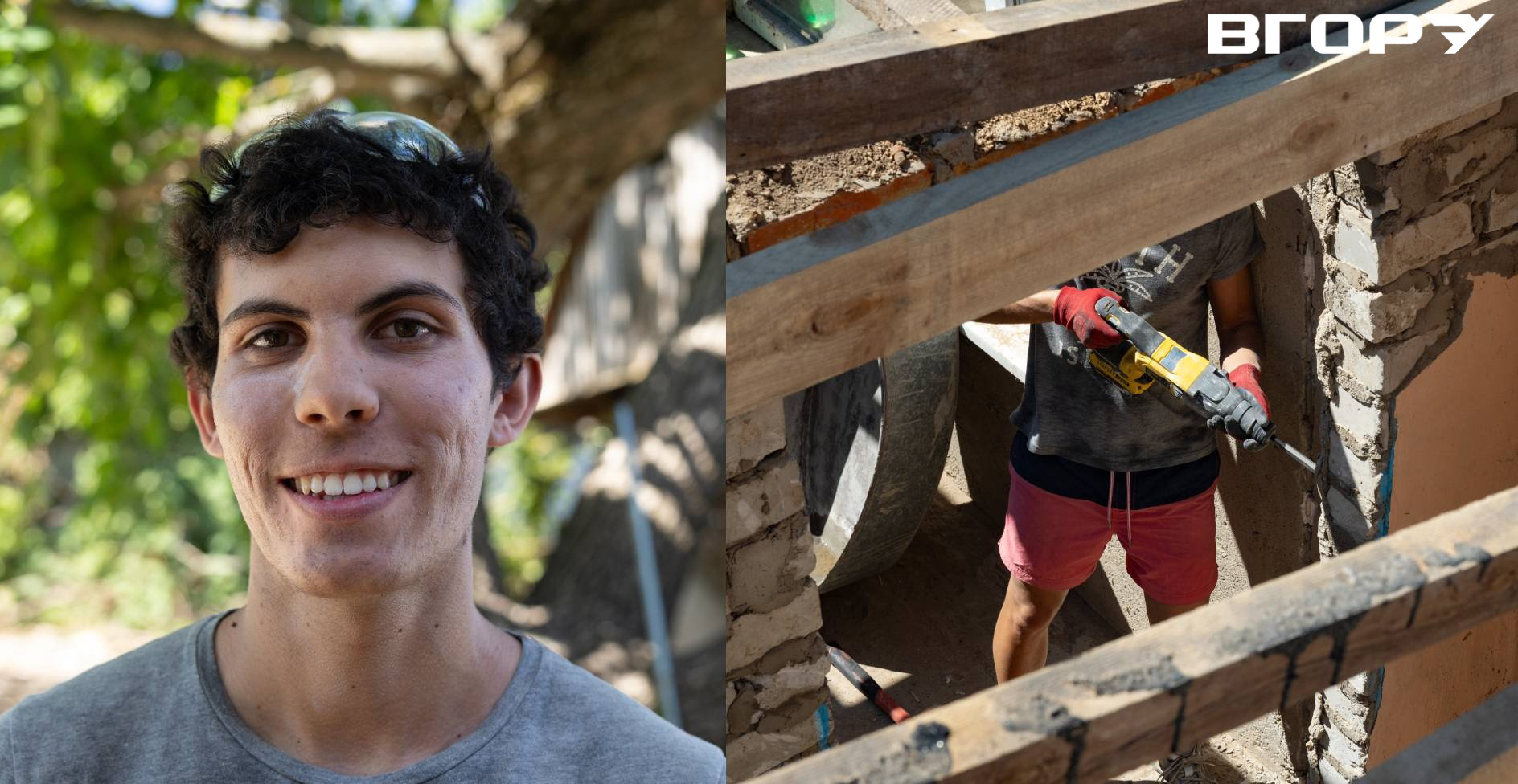 Дуарте працює з перфоратором всередині будинку. Йому 24 роки. Він приїхав на Херсонщину з Португалії, з Лісабону. Про БУР дізнався рік тому. Свій перший відбудовчий табір згадує, як один із найкращих досвідів. Тому, коли з'явилася можливість, вирішив повернутися.