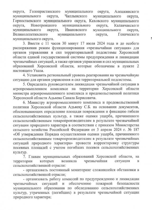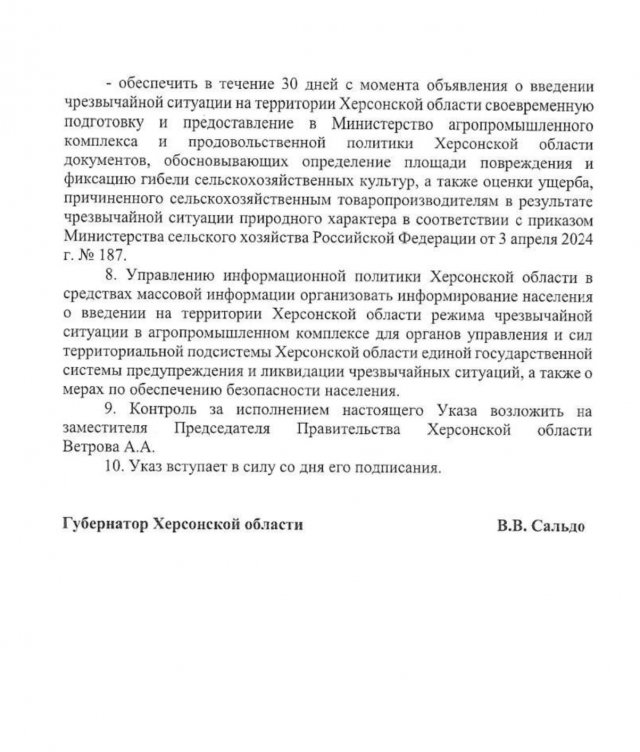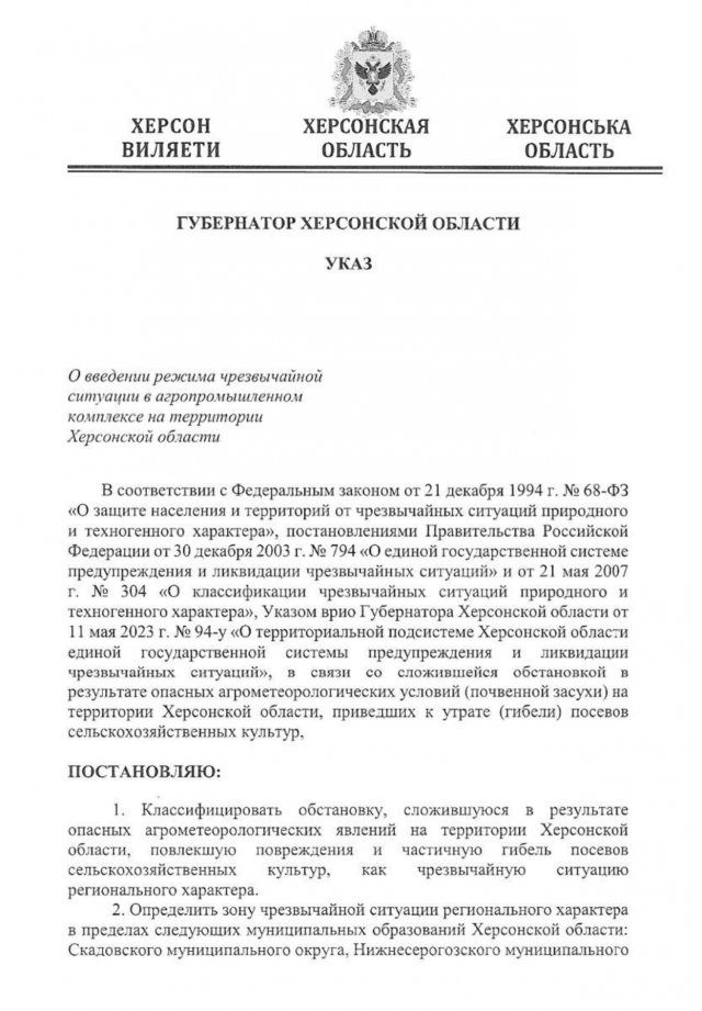 - написала окупаційна «Надднепрянская правда». При цьому послалась на слова «губернатора» Володимира Сальдо. «Багато господарств збирання хлібу вже завертають, - сказав колаборант пропагандистам. - Більше того, відповідно до проведених лабораторних аналізів, якість зерна нового врожаю доволі висока». Також, як вже писав Newday.ua, псевдогубернатор пообіцяв валовий збір близько 1,2 млн. тонн.Чи говорив Сальдо хоч коли-небудь правду? Ні! І цього разу не сказав. Не минуло і тижня з дня виходу окупаційної «НП», як «губернатор» підписав «указ» зі словами: «Постановляю: 1. Класифікувати обстановку, яка склалась у результаті небезпечних, агрометеорологічних явищ на території Херсонської області, яка спричинила пошкодження і часткову загибель посівів сільськогосподарських культур, як надзвичайну ситуацію регіонального характеру. «Ліквідувати» НС колаборант доручив окупаційному міністру АПК Херсонської області Саналу Адьяєву. Окупаційний телеканал «Таврия» відреагував блискавично: «Херсонські аграрії можуть розоритися через аномальну спеку».