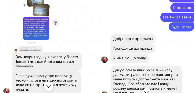"Запитала: "Хто буде везти?". Відповіла, що евакуаційне авто. Кажу: "А можна я зв’яжуся з цією людиною?" Вона дала телефон. Я написала, відповів чоловік, підтвердив, що буде їхати: "Є ще кілька місць, можу взяти вашу знайому з дитиною". Додав, що поїздка завтра, мовляв, треба виспатися. Тоді я попросила ще кілька хвилин уваги і запитала, чи можна перерахувати кошти, коли вже людей довезуть до місця призначення. Вони збиралися до Львова. Спочатку він написав: "У принципі, так". Потім передумав: "Ні, не можна. Мені потрібно купити пальне, а це все так дорого". І ще написав купу якихось слів про те, що дуже ризикує та інше".