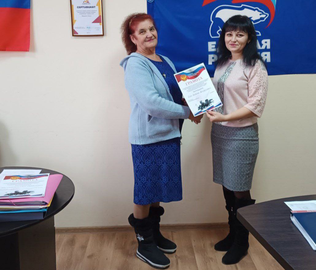 Колаборантки Ольга Мащенко і Ірина Новікова. Фото з окупаційного паблікаОтримала грамоту Сич Любов Олексіївна, пенсіонерка, голова громадської організації «Мир» мешканців житлового будинку №6 по вулиці 40 років перемоги села Коробки. Вона – біженка з російського міста Грозний, звідки свого часу тікала від російських бомбардувань.