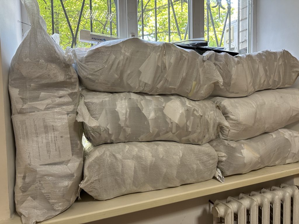 “Ще й під обстрілами сидіти”, – каже вона, вказуючи на вікна, закладені мішками та папками зі старими документами.