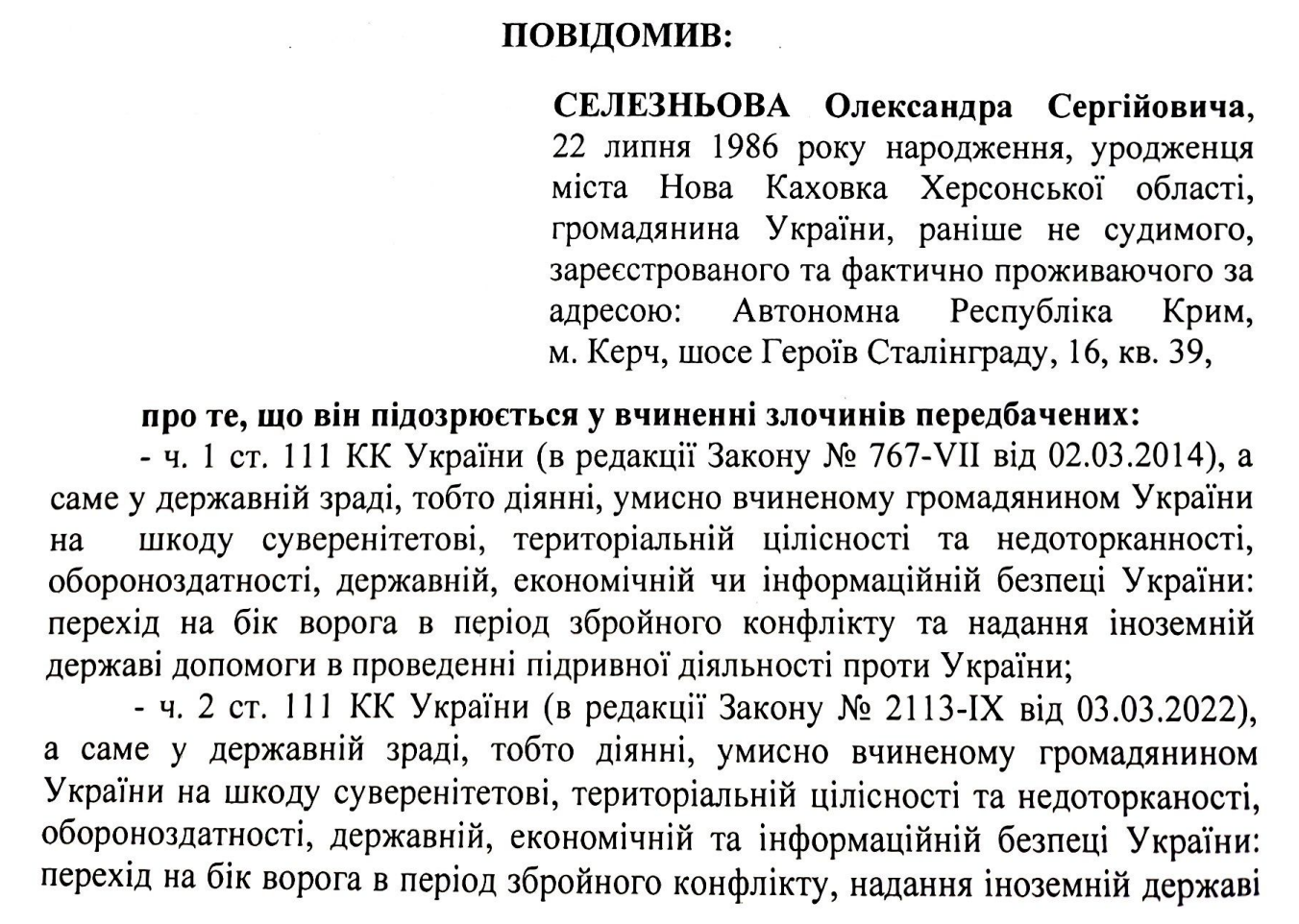 За це Олександра Селезньова підозрюють у скоєнні злочинів, передбачених ч. 1 ст. 111 КК України та ч. 2 ст. 111 КК України – державна зрада.