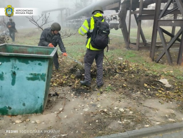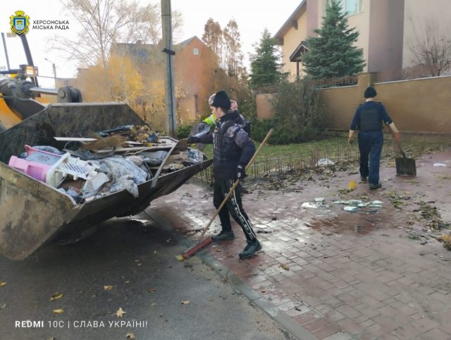 Роботи з прибирання територій та благоустрою міста, а також вивозу сміття тривають.Про це повідомляє пресслужба Херсонської МВА.