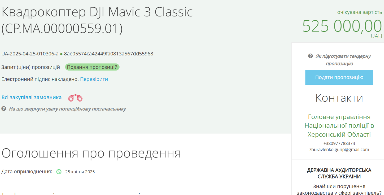 Обидві закупівлі класифікуються за кодом "вертольоти, літаки, космічні та інші літальні апарати з двигуном". Наразі триває прийом пропозицій. Постачальники повинні подати свої пропозиції з урахуванням технічних характеристик моделей та термінів постачання. Доставити дрони потрібно до 30 червня 2025 року в Херсон.
