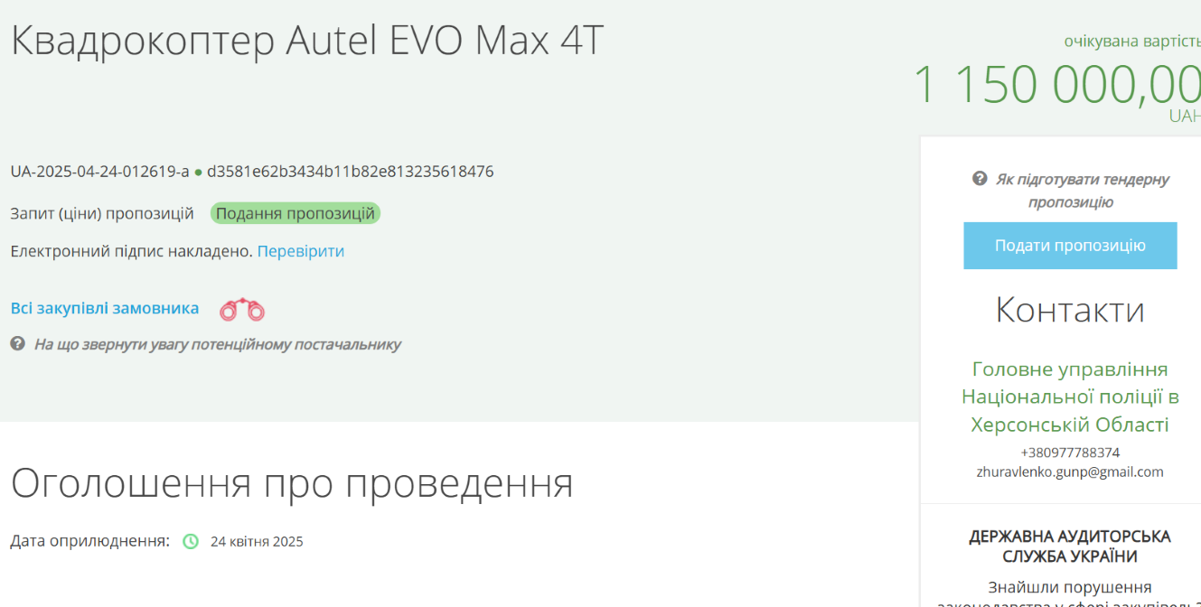 Очікувана вартість першої закупівлі становить 1 150 000 гривень. Йдеться про п’ять одиниць квадрокоптера Autel EVO Max 4T, який належить до високотехнологічних безпілотників із потужними камерами та можливістю роботи в складних умовах.