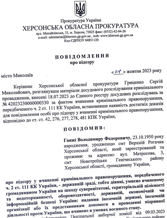 За це Володимиру Ганжі заочно загрожує 15 років в’язниці або довічне позбавлення волі (з конфіскацією майна або без такої). Триває досудове розслідування.