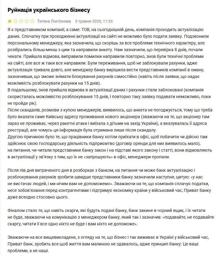 За словами підприємця, компанія намагалася пройти стандартну процедуру актуалізації даних, однак зіткнулася з низкою технічних проблем на сайті банку. Після звернення до персонального менеджера компанія все ж змогла подати необхідну анкету та почала чекати результатів перевірки, яка мала тривати вісім днів.