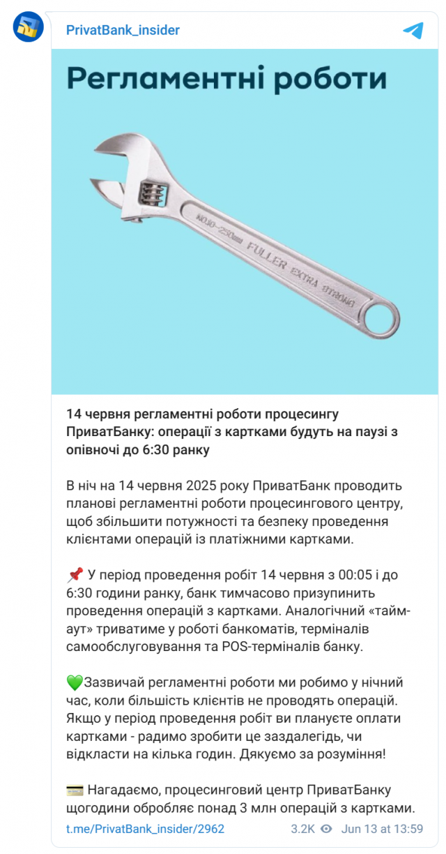 Протягом періоду з 00:05 до 6:30 години ранку 14 червня клієнти не зможуть здійснювати операції з картками. Аналогічні обмеження торкнуться роботи банкоматів, терміналів самообслуговування та POS-терміналів банку.