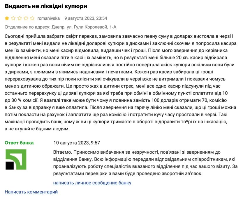 "Я взагалі таке може бути, чому я маю замість 100 доларів отримати 70, комісію в банку за відправку я вже сплатила. Після звернення на гарячу лінію мені сказали, що ці гроші можна потім покласти на рахунок і заплатити ще раз комісію та витратити купу часу таких, що простояли в черзі. Такі махінації проводить банк, чому ж ви ці купюри тримаєте в обороті, відправте, тв@ри, їх на інкасацію, а не туліть бідним людям", - йдеться у відгуку.