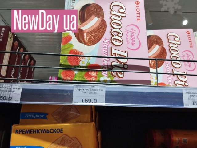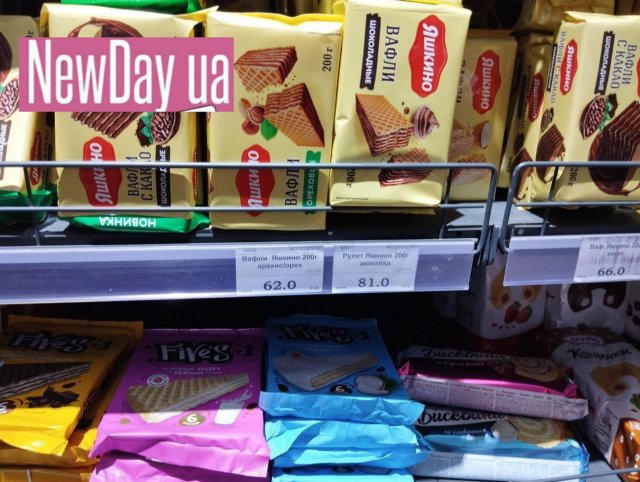 М’які, глазуровані шоколадом цукерки «Темна ніч» продають по 345, печиво «Неапольське» - по 220 руб/кг. Печиво «Кременкульське», яке виробляють аж у Челябінській області рф, з полуничною або вершковою начинкою в окупованому Генічеську коштує 91 рубль за 250 г. Вафлі «Яшкіно», які у приморське місто привозять з Томська (майже за 4500 км!) коштують від 62 (горіхові) до 81 (шоколадні) рубля за 200 г. Тістечко «Choco Pie» виробництва південнокорейської компанії «Lotte», яка, на жаль, працює на росії, продають по 159 рублів за 336 грамів.