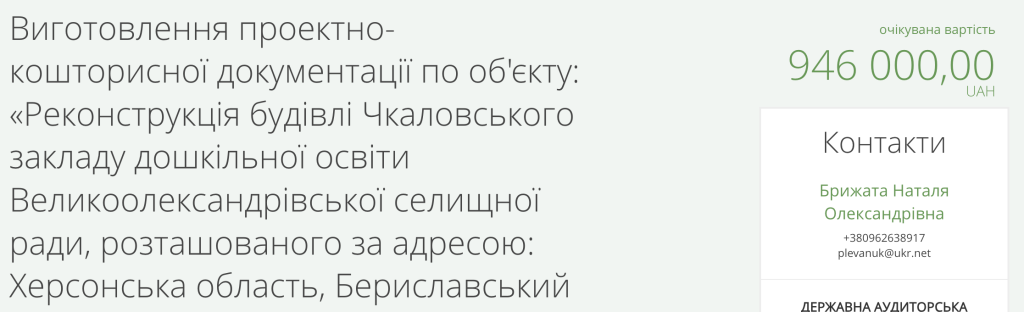 Зазначимо, що договір на створення проєктно-кошторисної документації для реконструкції дитсадка у Чкаловому було украдено без використання електронної системи закупівель, що обумовлено дією режиму воєнного стану.