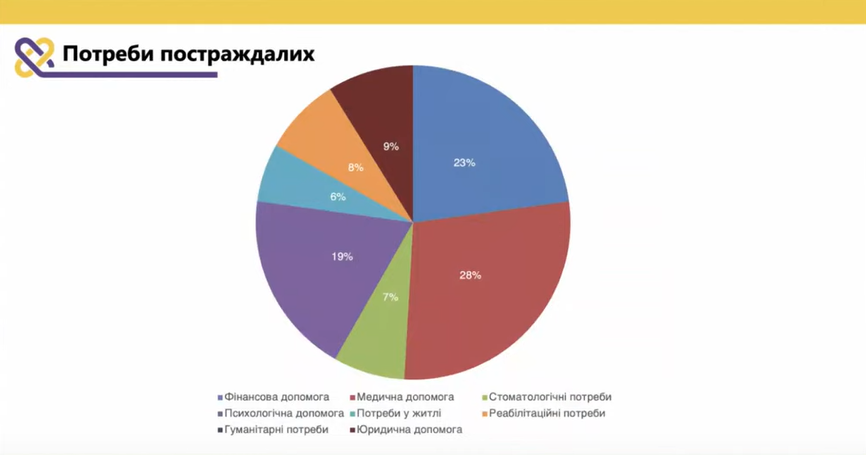 «Опитані нами учасники проєкту зазначали, що серед основних потреб постраждалих від СНПК є довготривала потреба в медичній допомозі (28%), психологічній (23%), фінансовій (19%), а також вони мають потреби у юридичній допомозі (9%), реабілітаційні потреби (8%), стоматологічні (7%), потребу у житлі (6%)», - сказав Дунебабін.