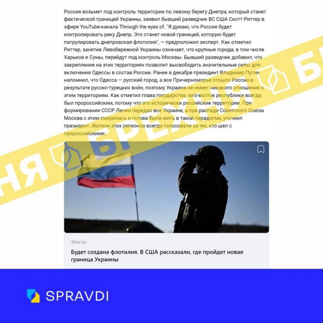 У Центрі стратегічних комунікацій та інформаційної безпеки спростували черговий фейк російських пропагандистів.“Брехня: річка Дніпро буде під контролем рф і вона стане новим кордоном України. Про це з посиланням на ексрозвідника Збройних сил США Скотта Ріттера пише пропагандистське псевдоЗМІ”, – повідомили у Центрі.