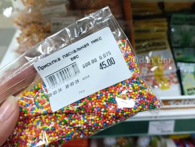 Дві упаковки саратовського маргарину обійшлись у 116 рублів, десяток яєць - 120 рублів (у Генічеську цей інгредієнт дешевший), упаковка дріжджів - 49, кілограмова упаковка борошна «Азовские пампухи» з окупованого Новоазовська - 34, ванілін - 16, родзинки з «братнього» Ірану (150 г) - 77 рублів. Три паперові формочки коштували 109 рублів. Для глазурі і прикрашання взяли 200-грамову пачку цукрової пудри за 57 рублів, 75 г посилки - 45, ще трішки посилки з зірочок - 28 рублів. Загальна сума за інгредієнти для випікання пасок становила 827 рублів. Якщо розділити на 12, то одна паска коштувала менше 70 рублів.