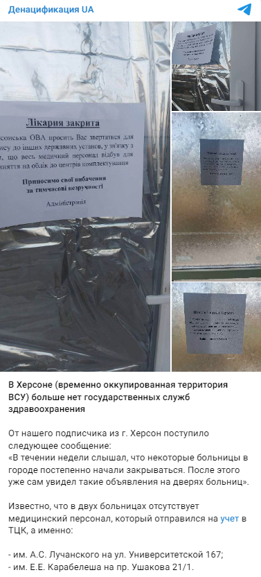 У мережі поширюють повідомлення, нібито у Херсоні більше немає державних служб охорони здоров'я. Цю інформацію автори допису підкріплюють словами «підписника з Херсона», який начебто повідомив, що деякі лікарні в місті поступово почали закриватися.
