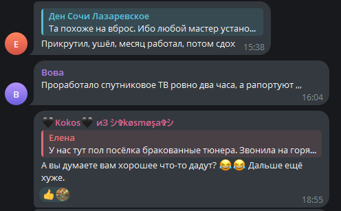 Херсонці вказують, що безплатне супутникове обладнання є дуже метеочутливим і навіть невеликий вітер створює перешкоди для сигналу. Цікаво, що без оплати “Русскій мір” отримали лише ті, хто погодився на заміну віддати свої старі, більш якісні супутникові тарілки. У кого ж їх не було, мали заплатити за “безплатне” телебачення кругленьку суму в рублях.