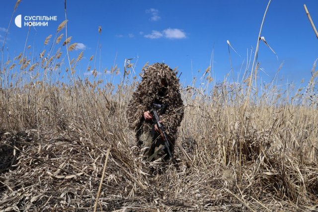 "Тут, на Херсонщині, багато дронів, найбільша небезпека від них, важко сховатися. Якщо зрозумів, що скид, у тебе є кілька секунд, щоб відбігти. От сьогодні якраз моделюємо таку ситуацію на островах", — каже військовий із позивним "Заєць", знімаючи з себе маскувальну кікімору після повернення з навчальної висадки на острів.