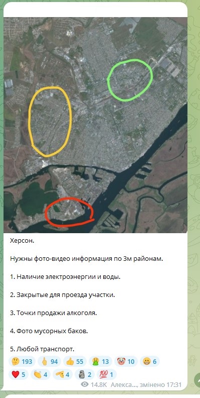 Окупаційні війська збирають інформацію для подальших обстрілів Херсона через підконтрольні Telegram-канали. Вчора про збір інформації оголосив один з таких.