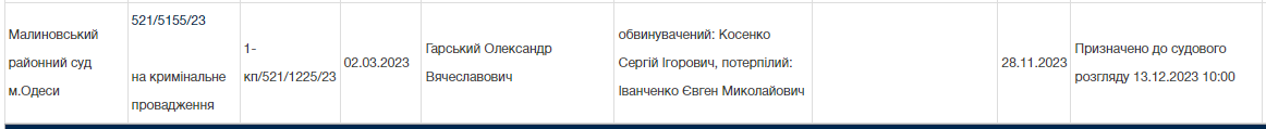 Слухання справи розпочнеться 13 грудня цього року в Малиновському районному суді Одеси. Про призначення розгляду повідомлено на сайті Судової влади України.