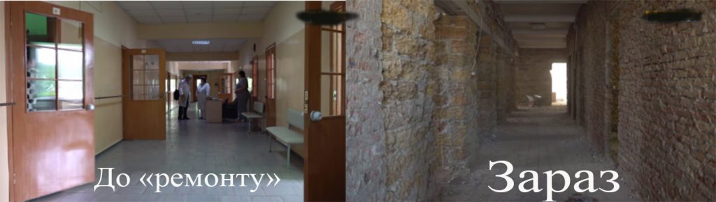Схожа історія з «Комплексним центром соціального обслуговування» у селищі Новотроїцьке. Його окупанти також взялись «відновлювати». У своєму серпневому відео російські журналісти зазначають, що приміщення центру було побудовано у 50-х роках ХХ століття і з того часу жодного разу не ремонтувалось. І в це, теоретично, можна було б повірити, якби у травні росіяни не зняли інший сюжет із цього ж центру, на якому чітко видно, що приміщення знаходиться якщо не в ідеальному, то у дуже гарному стані. А тепер просто порівняйте один з коридорів цієї установи до початку російського «ремонту» і після нього: