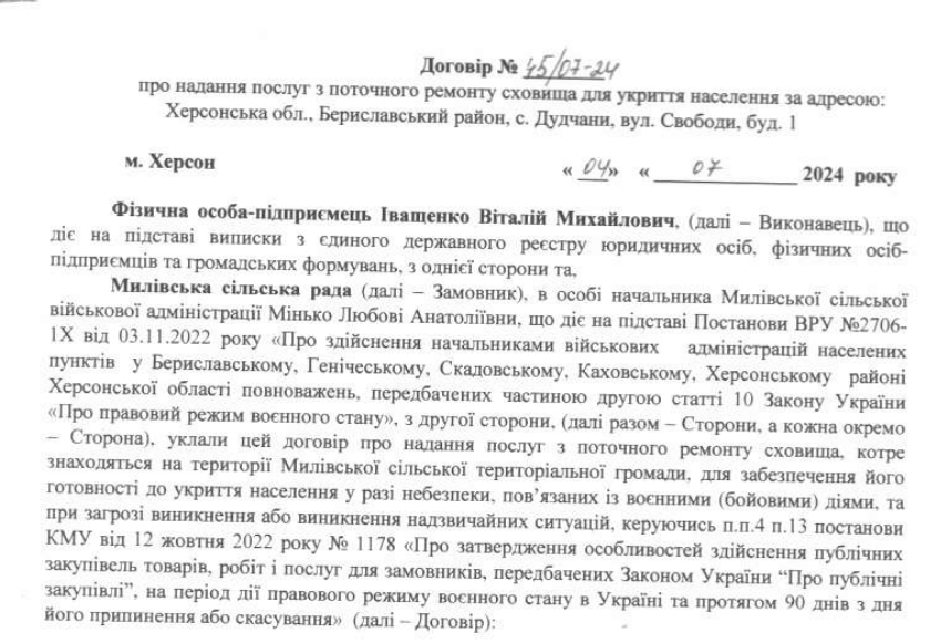Милівська сільська рада, що в Бериславському районі Херсонської області, уклала угоду на поточний ремонт укриття вартістю понад 882 тисячі гривень із підприємцем, який зареєструвався лише у травні 2024 року. Про це повідомляє «Антикорупційний вимір» із посиланням на Прозорро.