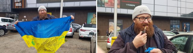 Фірмова люлька - в зубах, а в руках - синьо-жовтий прапор, розписаний побажаннями земляків.