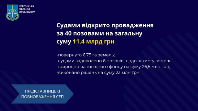 Представницька діяльністьОсобливу увагу прокурори приділяють поверненню земель природоохоронного призначення у державну власність. Наразі судами відкрито провадження за 40 позовами на загальну суму 11,4 млрд грн.
