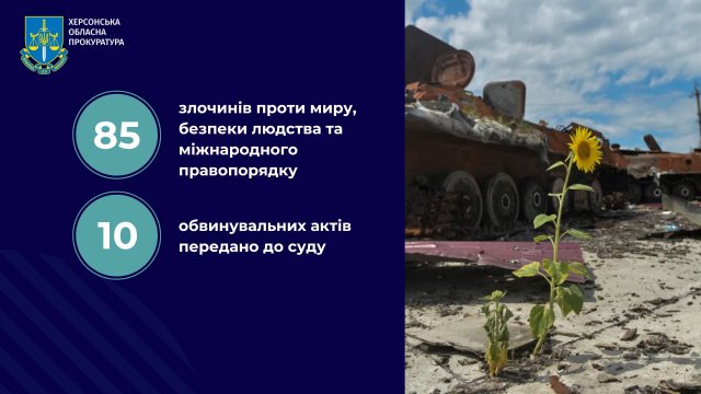 Злочини проти миру і довкілляСеред них 85 справ стосуються злочинів проти миру, безпеки людства та міжнародного правопорядку. Вони пов'язані з обстрілами російських військ, що призвели до знищення майна та завдали значної шкоди природному середовищу.